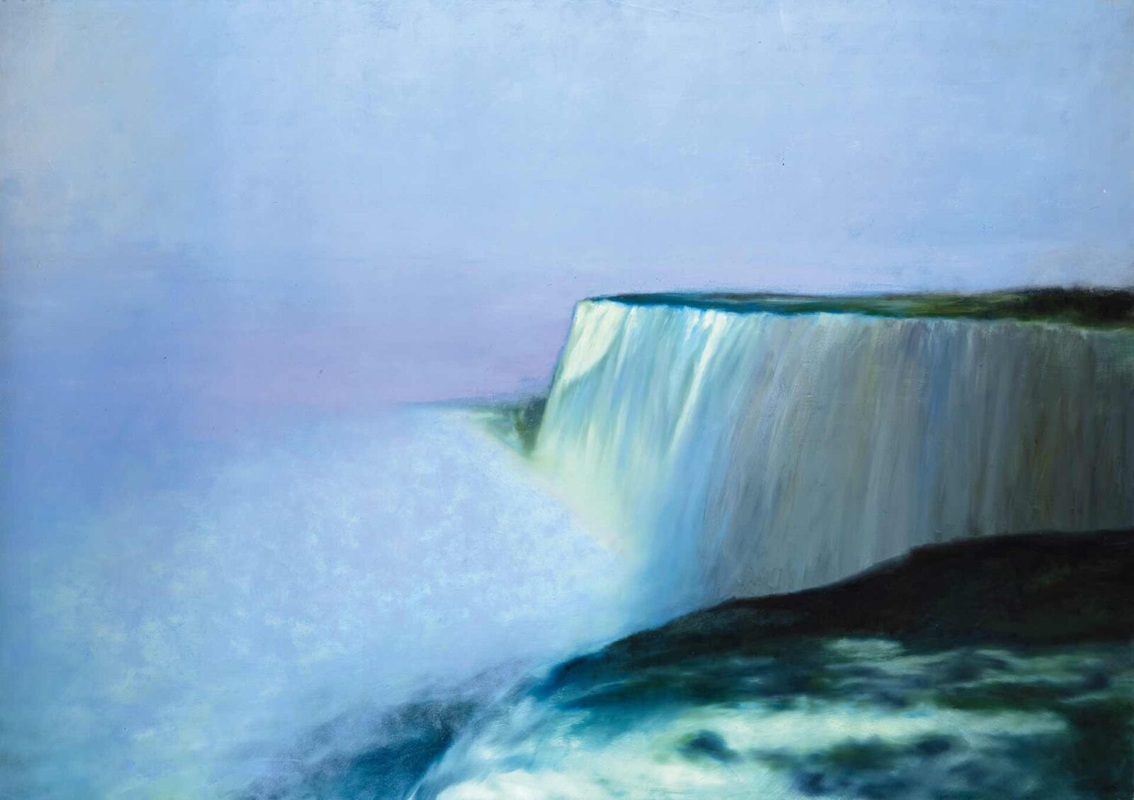 Olaj, vászon, 140 x 200 cm, Jelezve hátoldalon: Szűcs Attila 1997 „Vízesés”