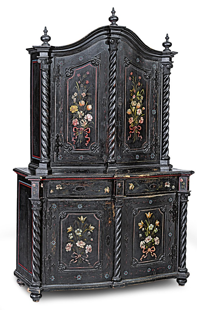 osztrák, 19. sz., faragott, esztergált, festett fenyőfa, sérült, 228*140*66 cm