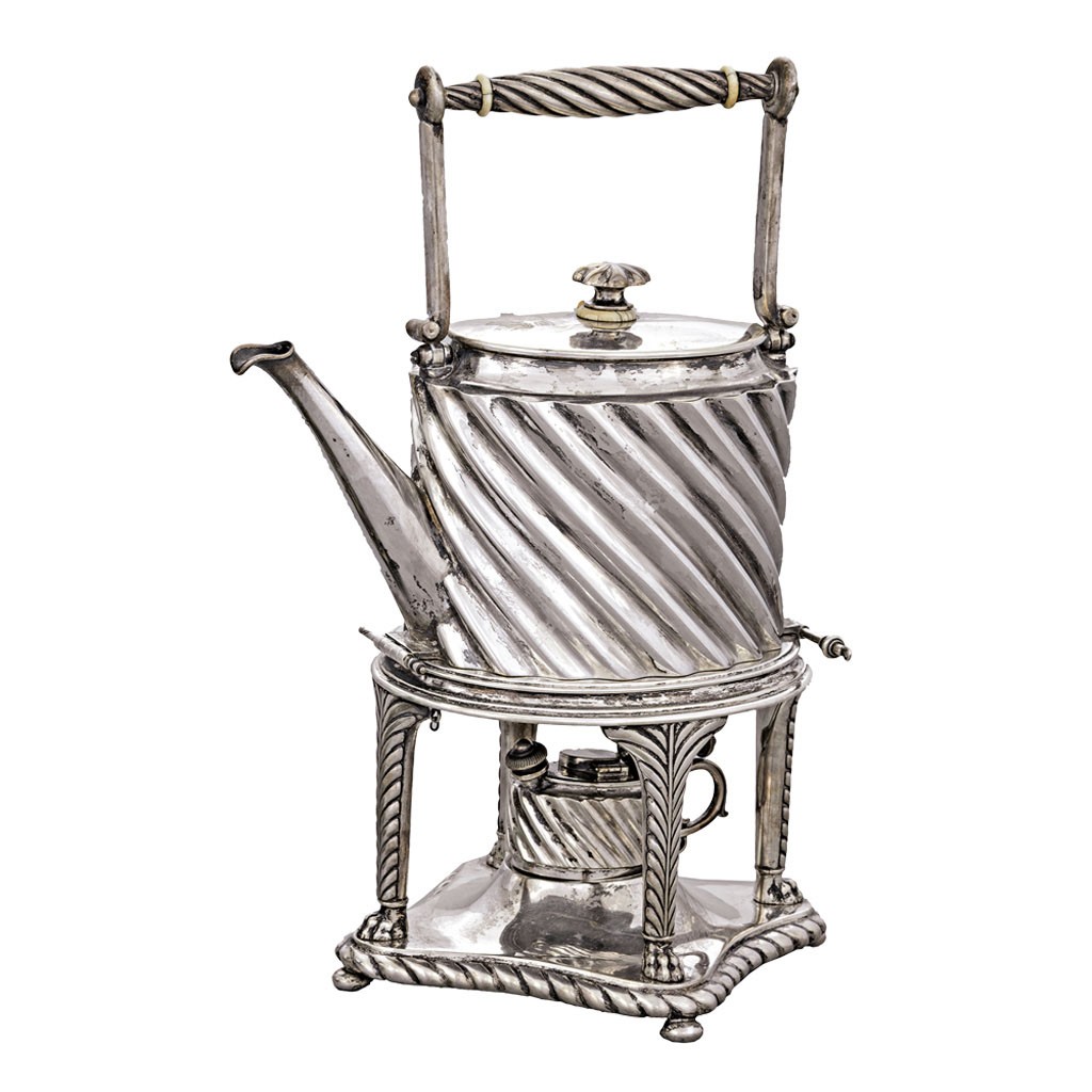 Bécs, 1872-1922 közötti fémjel, 800 ezrelékes ezüst, Wincenz Czokally forgalmazó és Bachruch Antal jegy, bécsi hivataljellel és behozatali jellel, oroszlánlábas talpazaton csavart bordás test, izolált csontgyűrűs fül és tetőgomb, fedelén vésett, grófi kor