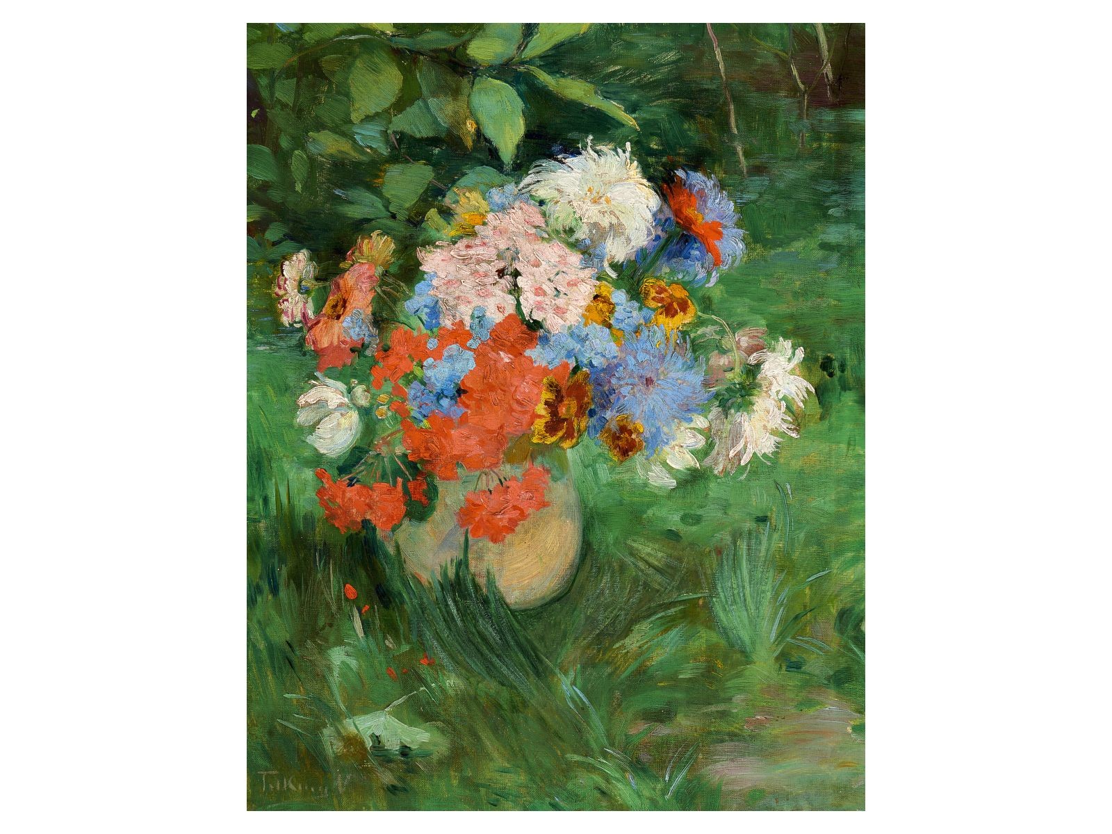 Kikiáltási ár: 55 000 FtKorga György (Budapest, 1935 – Kisoroszi, 2002) Ikebana Olaj, farost 60 × 80 cm Jelezve jobbra lent: Korga