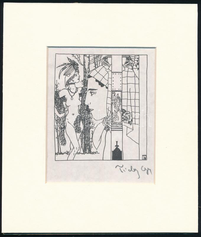 10210. tétel:Michel Fingesten (1884-1943): Ex libris Delage ( morbid, halálos szerelmet imitáló Ex libris a művész saját kezű aláírásával). Opus 1143. (1940 körül) Rézkarc, papír, jelezve jobbra lent, 132x88 mm. A csehországi születésű Michl Finkelstein (1884-1943) grafikusművész 1900-tól a bécsi Kunstakademie-ben tanult, Oskar Kokoschka társaságában. Félbehagyott tanulmányait Münchenben folytatta, majd 1913-tól Berlinben tanulta ki a rézmetszés fortélyait. A Michel Fingesten művésznevet felvevő grafikus az első világháború után a német némafilmes és illusztrátori világban dolgozott. A művészetét betiltó új német rezsim nyomása elől Milánóba költözött, ott fordult érdeklődése a kisgrafikák felé. Ex librisként feliratozott grafikái számos esetben a képzeletbeli megrendelő tulajdonságait növelik szürreális, művészi látomássá. Rézkarcunk ezúttal viszont feltehetően valós megrendelő, Albert Delage francia könyvgyűjtő számára készült. A morbid, szürreális grafika középpontjában földbe ásott, tövisekkel körbevett női fejet csókoló férfi arc kontúrjai sejlenek fel, a csókjelenet körül kaján örömmel vigyorgó emberi koponya, alul androgün, haláli harsonások veszik körbe az Ex libris feliratot, felül pedig Paul Verlaine francia költő korai verséből való idézet. A grafika alatt Michel Fingesten saját kezű aláírása. Tökéletes állapotú lap, paszpartuban, fakeretben, üveglap mögött.