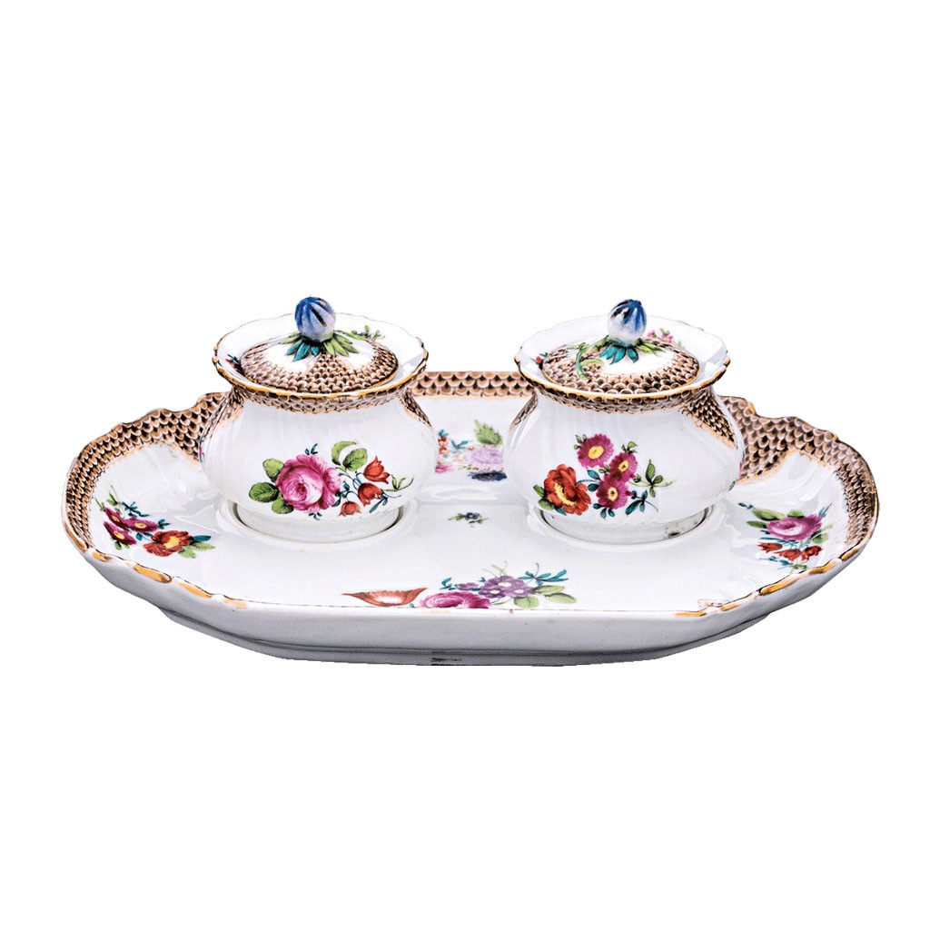Fischer Vilmos, 1885, festett, aranyozott porcelán, jelezve az alján: Fischer V. Kolozsvár 1885, masszába nyomott 1510, S, 7 fazonszám, 22*17 cm; m: 6,5 cm