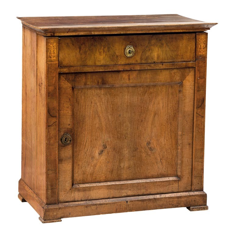 magyar, 19. sz. második fele, fenyőfa alapon diófa borítással, jávorfa intarziával, egy fiókkal, 1 db kulccsal, sérült, 80*76*42,5 cm