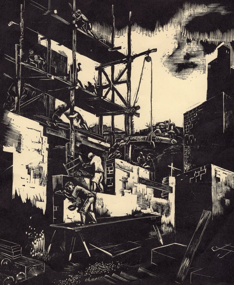 Vadász Endre (1901-1944): Hazatérők 1937. (Épül egy új ország). Fametszet (200/112), papír, jelzés jobbra lenn, 20×16 cm, enyhe gyűrűdéssel a széleken