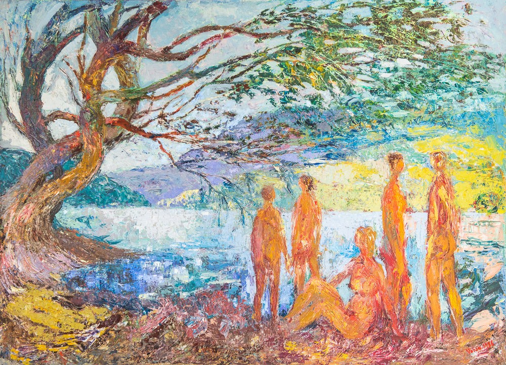 Varga József (1922-2021) : Dunaparti strandolók egy nagy fa alatt, 1986