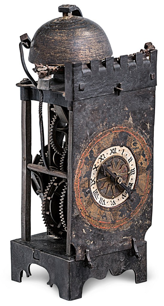 német, 1680-1720 körül, kovácsoltvas, spindlis nyitott szerkezet, római számos festett számlapgyűrű, sérült, hiányos, 28*10*9,5 cm