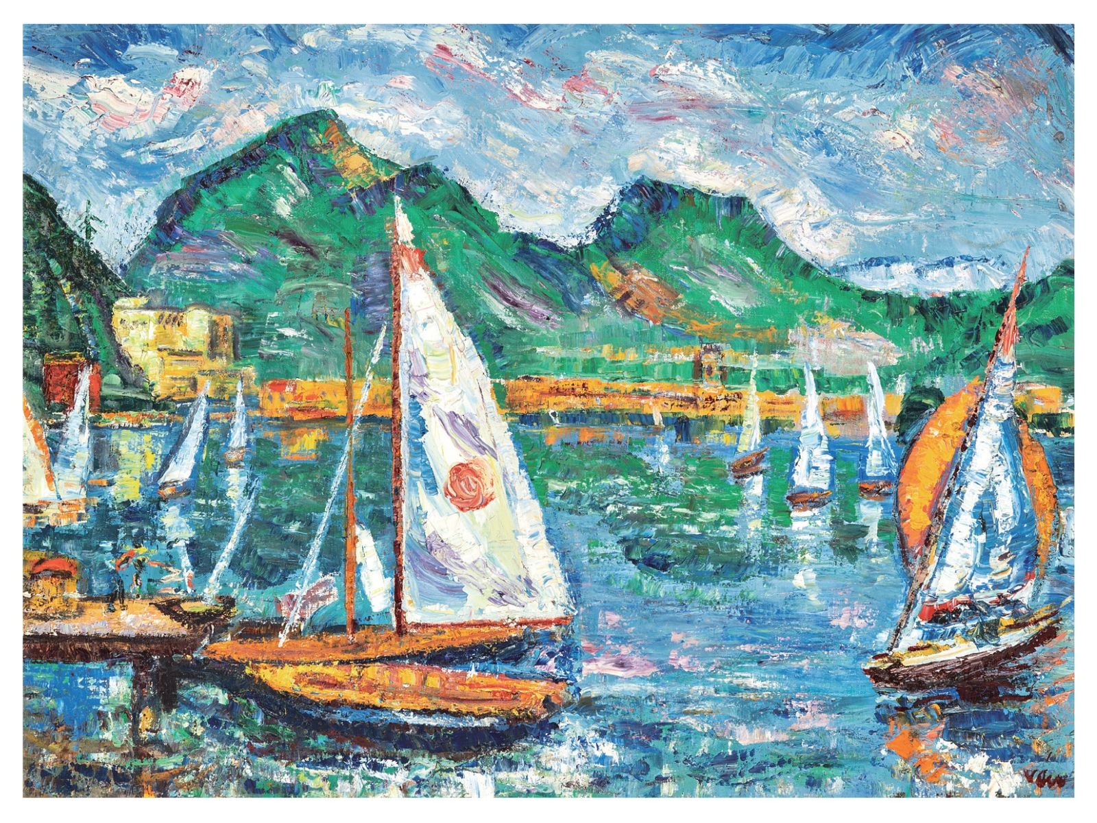 Kikiáltási ár: 48 000 FtÓvári László (Nyíregyháza, 1926 – Budapest, 1988) Balatoni táj Olaj, vászon 60 × 90 cm Jelezve balra lent: Óvári Hátoldalán Képcsarnoki etikett