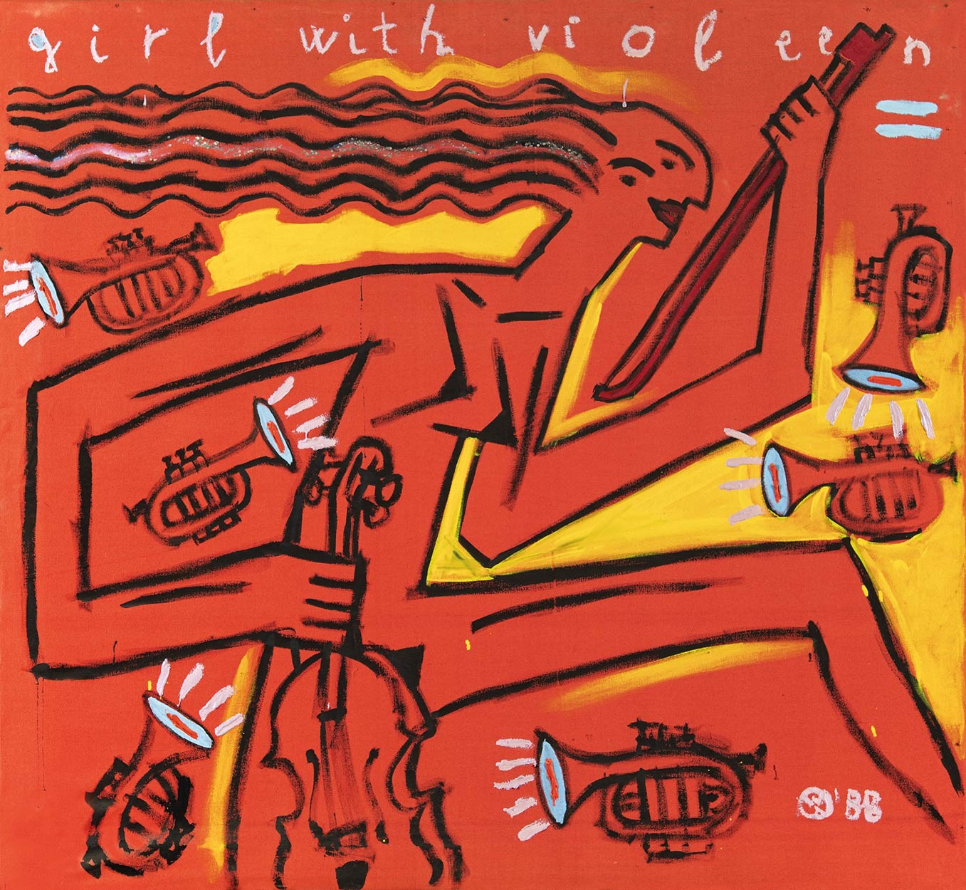 Olaj, vászon , 119,5 x 131 cm , Jelezve jobbra lent: WA ’88; Jelezve fent: Girl with violeen