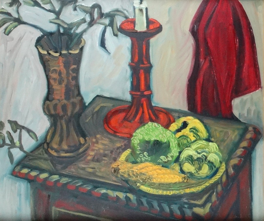 Weisz Zsuzsanna (1925 – 2017): Csendélet vörös drapériában, 1968.