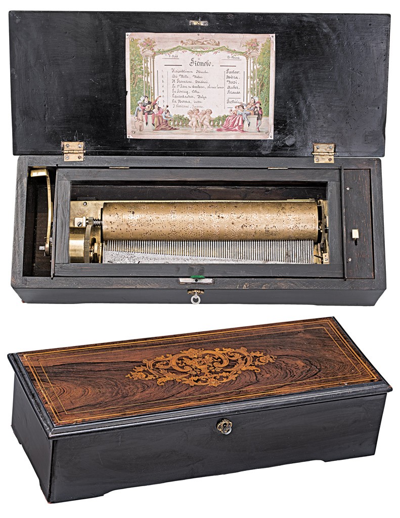 Svájc, 19. sz. második fele, fekete lakkfestett és diófa borítású tokban, intarziás díszítéssel, 8 dallamot játszó, működő zeneszerkezettel (kopott), 1 kulccsal, 13*56*22 cm