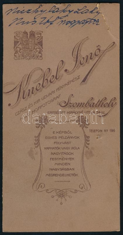1911 Szombathely, Dr. Laky Kristóf (1841 – 1920) cs. és kir. kamarás, kir. curiai biró, a szombathelyi kir. törvényszék elnökének dedikált portréfotója, keményhátú fotó, Knebel Jenő szombathelyi műterméből, körbevágott, a sarkán sérülésnyommal, 16×8 cm<br