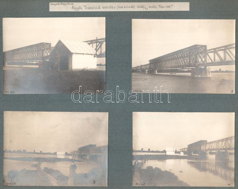 1912-13 Vasút- és hídépítés Pécelen és az algyői Tiszahídnál, össz. 14 db albumlapra ragasztott, feliratozott fotó, 8×11 cm körüli méretekben, egyik fotón apró szakadással.<a href="https://www.darabanth.com/hu/nagyaukcio/40/kategoriak~Mutargy-szobor