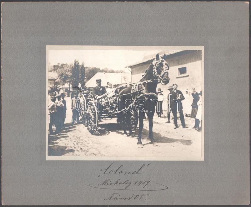 1917, Miskolc, ‘Colonel’ ló, egyenruhással a gyeplőnél, fotó kartonra ragasztva, jelzés nélkül, 12×17 cm.<a href="https://www.darabanth.com/hu/gyorsarveres/423/kategoriak~Fotomuveszet/Foto~44/1917-Miskolc-Colonel-lo-egyenruhassal-a-gyeplonel-foto-ka