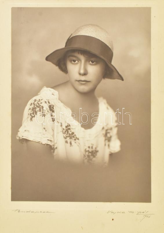 1926 Vajda M. Pál budapesti fényképész aláírt, datált és matricával jelzett, vintage műtermi felvétele (kalapos női portré), 23×17 cm, karton 38,6×31 cm