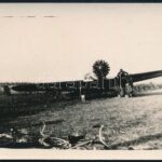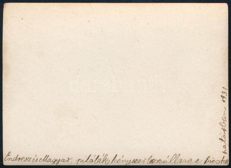 1931 Endresz György (1893-1932) és Magyar Sándor pilóták kényszerleszállása a bicskei határban, rajta a „Justice for Hungary” repülővel, a hátoldalán feliratozott fotó, 6×9 cm