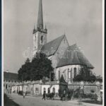 1940 Dés (Erdély), templom magyar zászlóval, konflisokkal, hátoldalon feliratozott és pecsételt fotó, szép állapotban, 17,5×12 cm