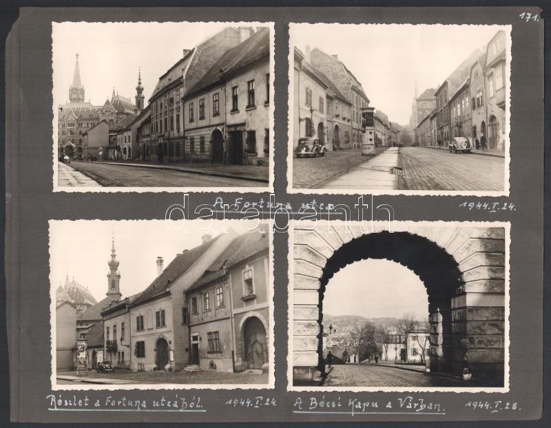 1943-1944 Budapest, Vár, Fortuna utca, Bécsi kapu, Pesthidegkút, stb., 8 db albumlapra ragasztott fotó, feliratozva, 9×11,5 cm<a href="https://www.darabanth.com/hu/gyorsarveres/425/kategoriak~Fotomuveszet/Foto~500022/1943-1944-Budapest-Var-Fortuna-u
