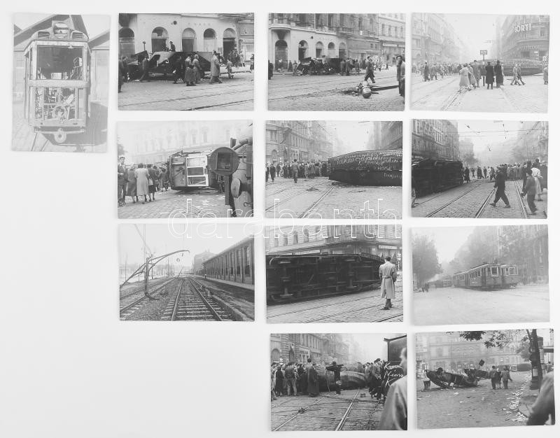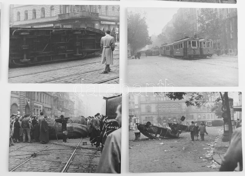 1956 Budapest, felvételek a forradalom időszakából, felborult villamos, utcaképek, stb., 12 db fotó, 10,5×14,5 cm<a href="https://www.darabanth.com/hu/nagyaukcio/40/kategoriak~Mutargy-szobor-papirregiseg/Foto~16771/1956-Budapest-felvetelek-a-forrada