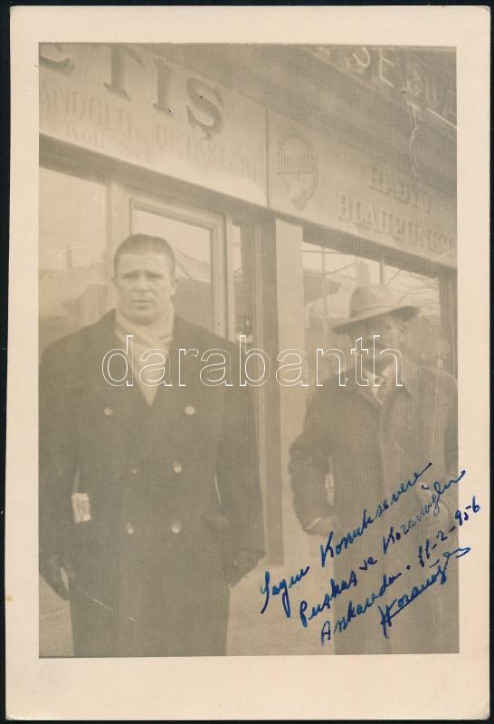 1956 Puskás Ferenc (1927-2006) labdarúgó társaságban egy üzlet előtt, fotó, feliratozva, 18×12,5 cm