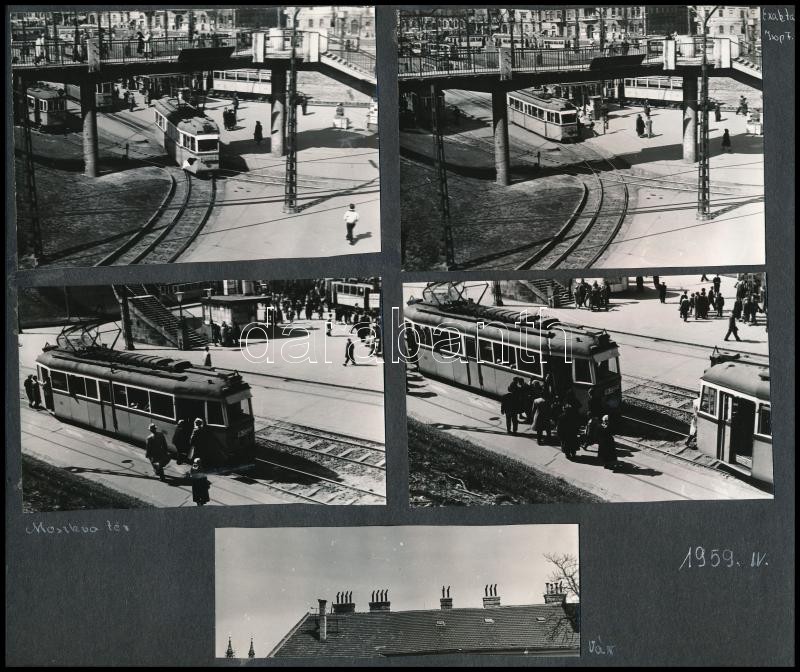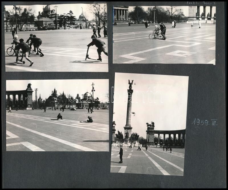 1959 4 db fotó Moszkva téri villamosfogalom, 4 db fotó Hősök terén gyerekek játszanak. Kartonra ragasztva. kb 9×12 cm / db
