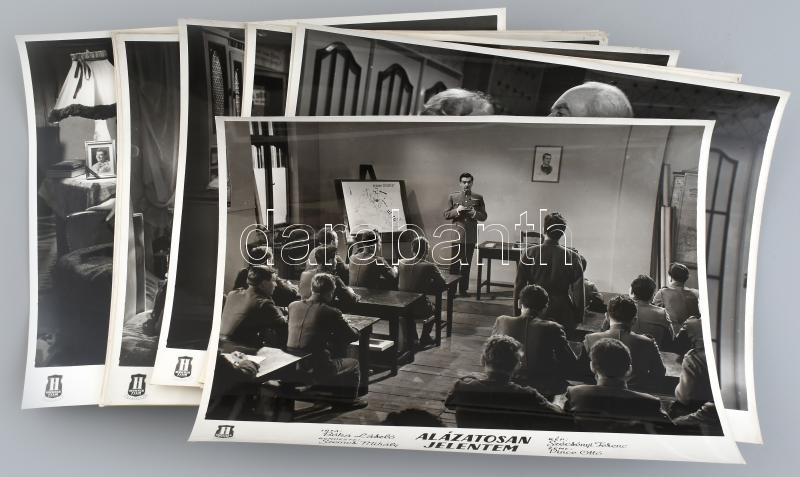 1960 ,,Alázatosan jelentem’ című magyar film jelenetei és szereplői (köztük Gábor Miklós, Uray Tivadar, Ruttkai Éva, Szirtes Ádám), 13 db vintage produkciós filmfotó, ezüstzselatinos fotópapíron, 24×30 cm<a href="https://www.darabanth.com/hu/gyorsar