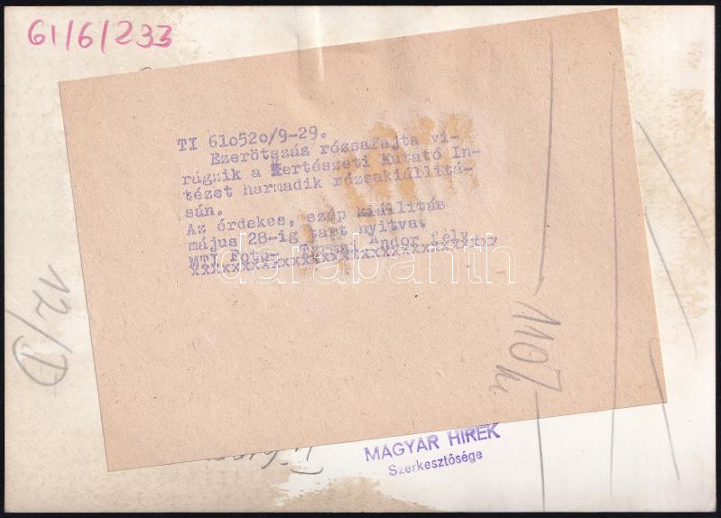 1961 Rózsakiállítás a Kertészeti Kutató Intézetben, sajtófotó, a hátoldalon feliratozott, pecséttel jelzett (MTI Foto – Magyar Hírek), 18×13 cm<a href="https://www.darabanth.com/hu/gyorsarveres/438/kategoriak~Mutargy-papirregiseg-egyeb/Foto~500023/1