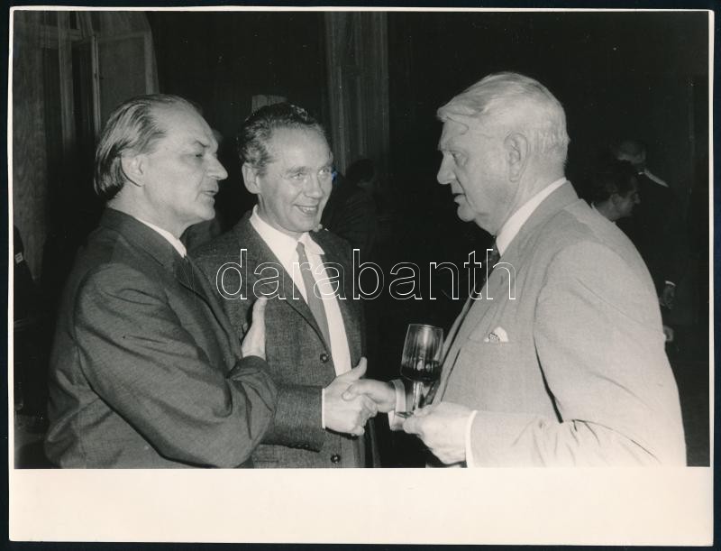 1967 szept., Keresztury Dezső író, korábbi vallás- és közoktatásügyi miniszter; Hubay Miklós író, később a Magyar Írószövetség elnöke és Arthur Burkhard a budapesti Fészek-klubban, hátoldalán pecséttel jelzett és feliratozott fotó, Kemény László fotóripor