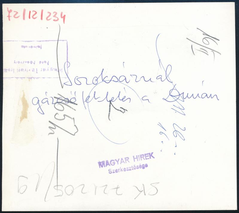 1972 Gázcső fektetés a Dunán Soroksárnál, sajtófotó, a hátoldalon feliratozott, pecséttel jelzett (Magyar Hírek – MTI Fotó Főosztály), 14,5×13 cm<a href="https://www.darabanth.com/hu/gyorsarveres/439/kategoriak~Fotomuveszet/Foto~1000023/1972-Gazcso-