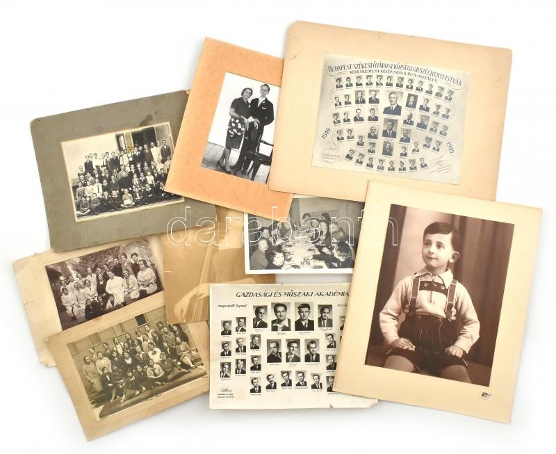 9 db vegyes, nagyrészt kartonra kasírozott fotó (közte a ‘Regele Ciocolatei’ román bonbon- és csokoládégyár dolgozóinak csoportképe, portrék, tablófotók), vegyes állapotban, 15×11 cm és 23×17,5 cm között<a href="https://www.darabanth.com/hu/gyorsarv