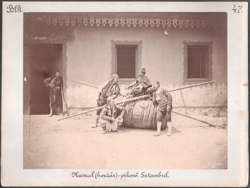 Berggren, Guillaume Gustave (1835-1920): Hamal (hordár) pihenő Sztambulban. Albumin fotó kartonon Cholnoky Jenő földrajztudós és utazó feliratozásával 25×33 cm / Berggren, Guillaume Gustave (1835-1920): Hamal (porter) rest in Istanbul. Albumen photo on cardboard with captions by geographer and traveler Jenő