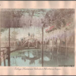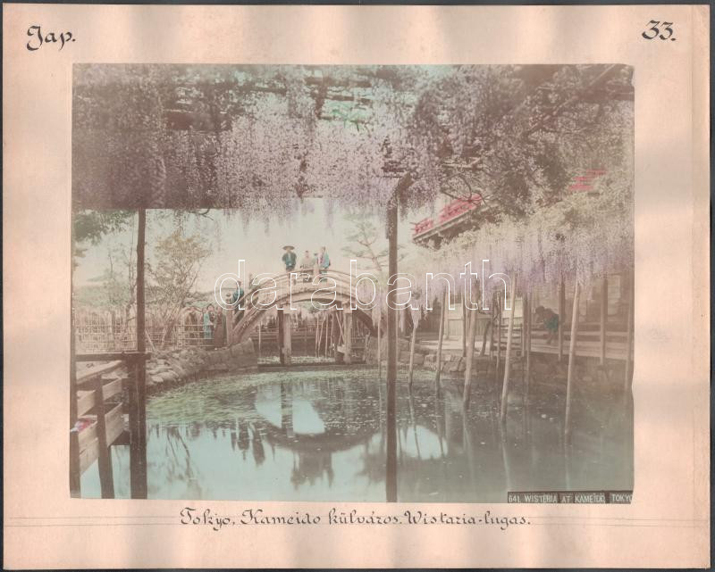 ca 1890 Kusakabe Kinbei, (1841-1932) Japán, Tokio Kameido Wistaria bosket / Ueno, Cholnoky Jenő földrajztudós és utazó által feliratozott fotó kétoldalas fotó 33×26 cm / circa 1890 Japanese Kusakabe Kinbei (1841-1932), photos Kameido, Tokyo / Ueno park tea house double-sided cardboard hand-colored albumen photos inscibed by Hungarian traveller 33×26