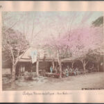 ca 1890 Kusakabe Kinbei, (1841-1932) Japán, Tokio Kameido Wistaria bosket / Ueno, Cholnoky Jenő földrajztudós és utazó által feliratozott fotó kétoldalas fotó 33×26 cm / circa 1890 Japanese Kusakabe Kinbei (1841-1932), photos Kameido, Tokyo / Ueno park tea house double-sided cardboard hand-colored albumen photos inscibed by Hungarian traveller 33×26 cm