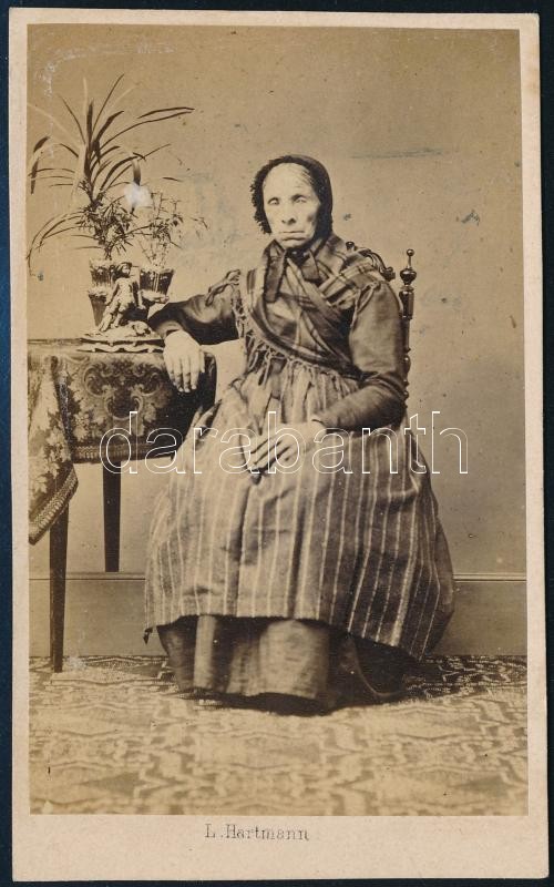 cca 1860-1880 Idős asszony, keményhátú fotó L. Hartmann műterméből, vizitkártya, 10×6 cm<a href="https://www.darabanth.com/hu/gyorsarveres/423/kategoriak~Fotomuveszet/Foto~44/cca-1860-1880-Idos-asszony-kemenyhatu-foto-L-Hartmann-mutermebol-vizitkart