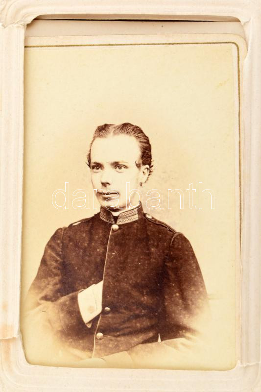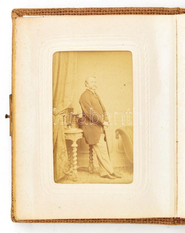 cca 1860-1890 Dekoratív rézveretes, vászonborítású fotóalbum, benne vizitkártyák magyar és külföldi műtermekből (Pest, Bécs, Temesvár, stb.), közte érdekesebb, nevesített személyek (vizmai Lukács Mór MTA-tag, Prónay család tagjai, stb.), egyenruhások, kat