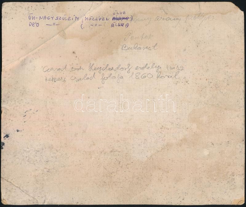 cca 1860 Michael Conrad von Heidenforf erdélyi szász nemesi család fotója, feliratozva, nevesítve. rajta Anton Zibrzid bukaresti gyógyszerészt ábrázoló. Kartonon, sérült. 24×21 cm / Photo of a Saxon family from Transylvania on