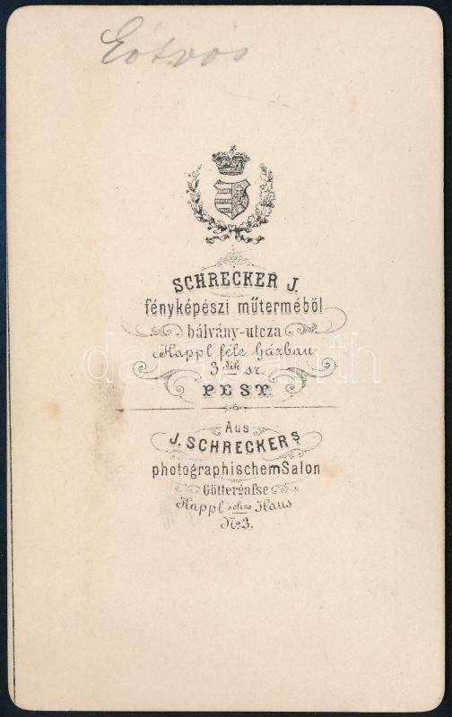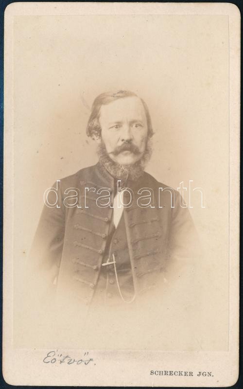 cca 1865 Eötvös József (1813-1871) író, jogász, az MTA tagja és elnöke, országgyűlési képviselő, Magyarország vallás- és közoktatásügyi minisztere (1848, 1867-1871), keményhátú portréfotó Schrecker Ignác pesti műterméből, 10×6 cm<a href="https://www