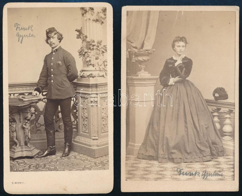 cca 1865 Funk Gyula és felesége Funk Gyuláné, 2 db keményhátú fotó Simonyi pesti műterméből, 10,5×6,5 cm<a href="https://www.darabanth.com/hu/gyorsarveres/425/kategoriak~Fotomuveszet/Foto~500022/cca-1865-Funk-Gyula-es-felesege-Funk-Gyulane-2-db-keme