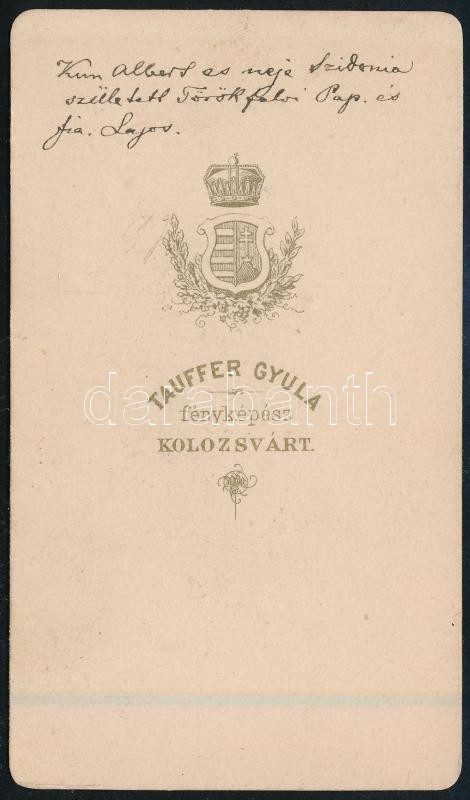 cca 1865 Kolozsvár, Kun Albert és neje, keményhátú fotó Tauffer Gyula műterméből, 10,5×6,5 cm<a href="https://www.darabanth.com/hu/gyorsarveres/426/kategoriak~Fotomuveszet/Foto~500023/cca-1865-Kolozsvar-Kun-Albert-es-neje-kemenyhatu-foto-Tauffer-Gyu