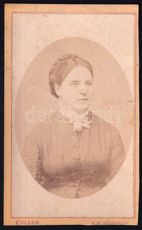 cca 1875 Női portré, keményhátú fotó Plohn hódmezővásárhelyi műterméből, 10,5×6,5 cm<a href="https://www.darabanth.com/hu/gyorsarveres/439/kategoriak~Fotomuveszet/Foto~1000023/cca-1875-Noi-portre-kemenyhatu-foto-Plohn-hodmezovasarhelyi-mutermebol-10