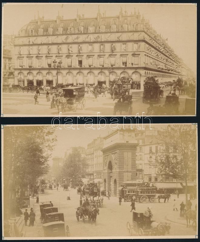 cca 1880-1900 Párizs, utcaképek lovaskocsikkal, 2 db keményhátú fotó, 17,5×10,5 cm / Paris, streets with horse-drawn carriages, 2 vintage photos<a href="https://www.darabanth.com/hu/gyorsarveres/423/kategoriak~Fotomuveszet/Foto~44/cca-1880-1900-Pari