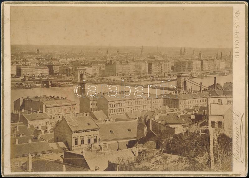 cca 1880 Budapest, Lánchíd a budai oldalról, keményhátú fotó Weinwurm műterméből, felületén piros ceruzás firkálás nyomával, 20,5×29 cm<a href="https://www.darabanth.com/hu/gyorsarveres/423/kategoriak~Fotomuveszet/Foto~44/cca-1880-Budapest-Lanchid-a