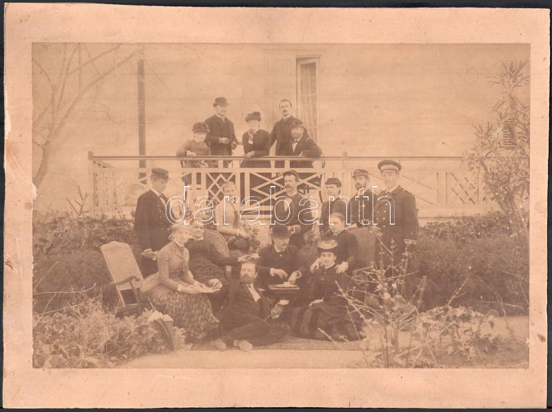 cca 1900-1910 Előkelő hölgyek és urak csoportképe, osztrák-magyar hajóstisztek társaságában, nagyméretű, kartonra kasírozott fotó, szélén kis sérülések, 36×24 cm / Group of elegant ladies and gentlemen with Austro-Hungarian naval officers, large-size vint