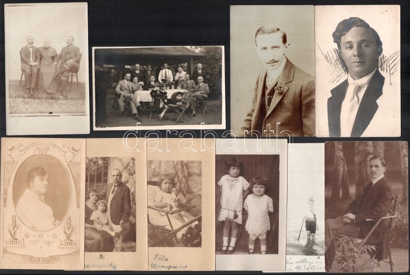 cca 1900-1940 10 db régi fotólap (portrék, családi képek), többségük feliratozva, 14×9 cm