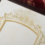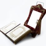 cca 1900 Díszes fotóalbum, tükörrel, fa állvánnyal, restaurált, album: 27×22 cm, állvány: 44×28 cm