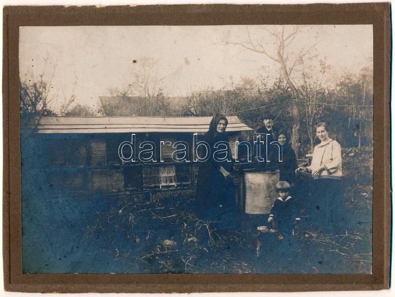 cca 1910 Katalinfalva (Kathreinfeld/Ravni Topolovac), méhészkedő család, fotó kartonon, a fotó felületén kis foltokkal, 14×18 cm