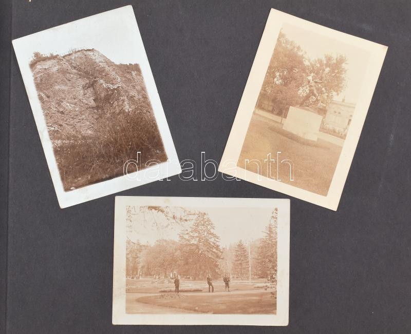 cca 1920 Családi fotóalbum, egy-két katonai portréval, biciklis fotóval, kastélypark, Tahi hajó, stb, vegyes méretben<a href="https://www.darabanth.com/hu/gyorsarveres/423/kategoriak~Fotomuveszet/Foto~44/cca-1920-Csaladi-fotoalbum-egy-ket-katonai-po
