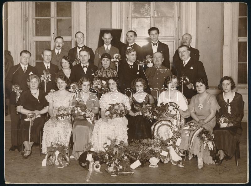 cca 1930-1940 Báltermi csoportkép, rajta magas rangú katonatiszt, hölgyek koszorúkkal, nagyméretű fotó, 23,5×17,5 cm<a href="https://www.darabanth.com/hu/gyorsarveres/425/kategoriak~Fotomuveszet/Foto~500022/cca-1930-1940-Baltermi-csoportkep-rajta-ma