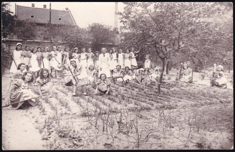 cca 1930 Bp., intézeti lányok kertészfoglalkozáson, fotólap, 9×14 cm