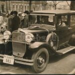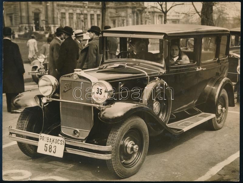 cca 1930 Fiat 521 automobil próbakocsi 583 felirattal vagy rendszámmal a lökhárítón, elegáns hölgy a volán mögött a Városligetben, háttérben a Széchenyi fürdő, hátoldalán feliratozott vintage sajtófotó, jelzés nélkül, a