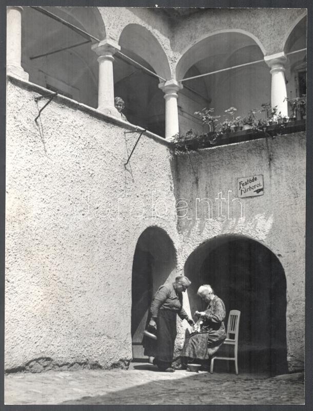 cca 1935 Osoha László (1899-1970) budapesti fotóművész hagyatékából 1 db vintage fotóművészeti alkotás, pecséttel jelzett, feliratozva (Old Women), ezüst zselatinos fotópapíron, két kiállítási emlékjeggyel a hátoldalán, 36×27 cm